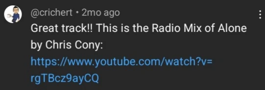 Around 15 hours later, YouTube user Cory Richert commented on Barni’s reupload, identifying the song as the radio mix of Alone by Chris Cony[4], presumably after he recognized it, as it had multiple reuploads on YouTube.