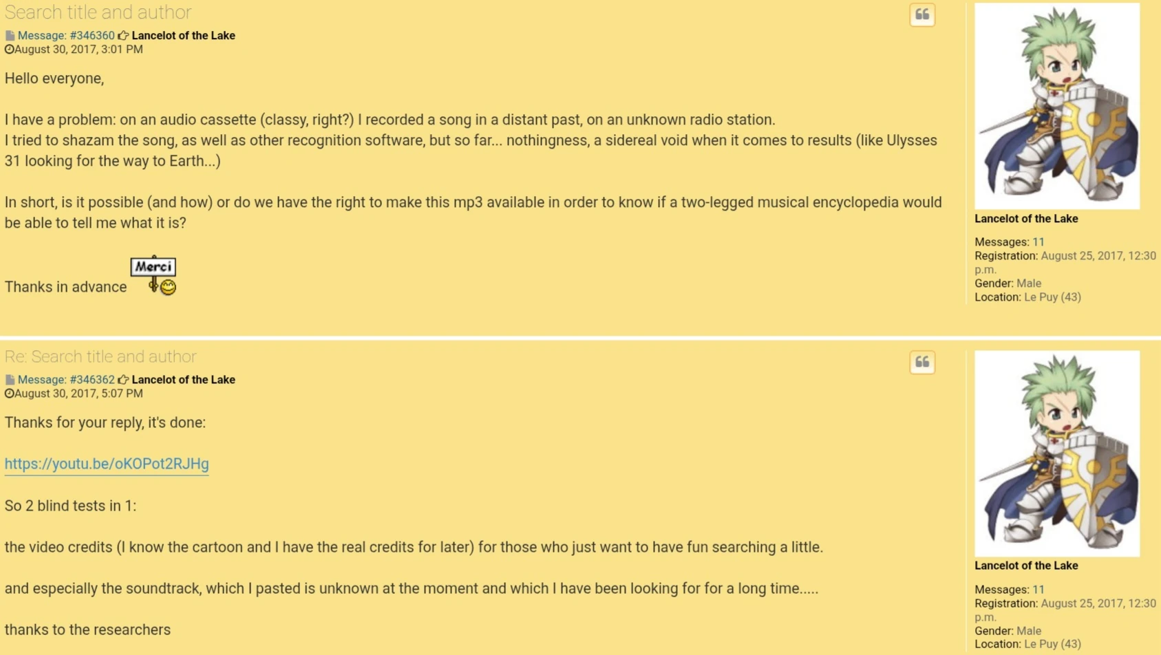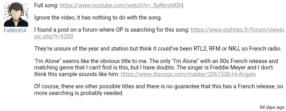 On July 5th, 2025, user Fatbird discovered the full version of the song in two YouTube uploads posted on a day before and a day after the original post. He also discovered a post on French music forum Eighties.fr[2], which read: