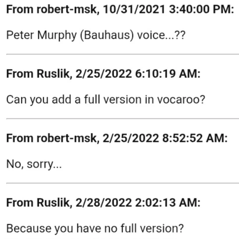 On February 25th, 2022, when asked by user Ruslik if they could post the full version to Vocaroo, the OP said they couldn't.[2]