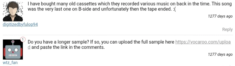 "I have bought many old cassettes which they recorded various music on back in the time. This song was the very last one on B-side and unfortunately then the tape ended. :("[1]
