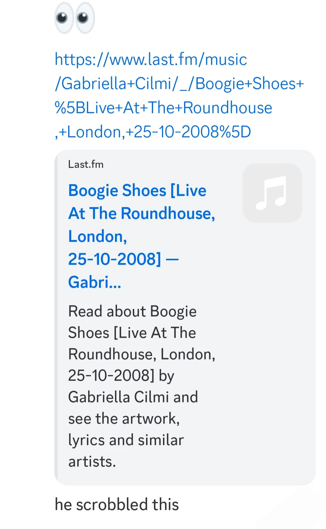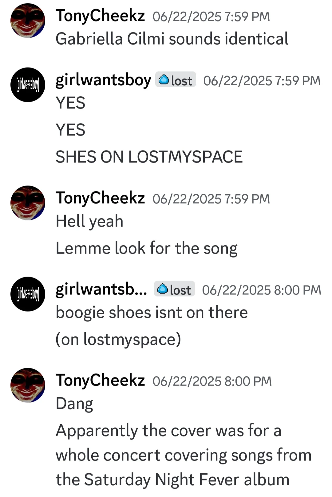 On June 22nd, 2025, Discord user Girlwantsboy discovered mention of a 2008 live cover of Boogie Shoes done by Australian musician Gabriella Cilmi after looking for the song through the Last.fm scrobbles of a user named Chug-A-Lug[1][2], who had also scrobbled various other solved tracks from shedrock. GWB theorizes that Shedrock and Chug are the same person, and Shedrock posted his samples as quizzes, but nothing is confirmed.