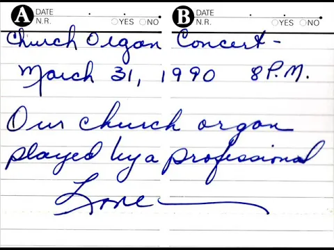 Church Organ Concert is an unidentified cassette recording of the organ concert at an unknown church, recorded on March 31st, 1990, 8PM. It is performed by "a professional" according to the card and also features the audience singing altogether. Its entirety is over 45 minutes, making it the second longest lostwave song, being beaten by "Subliminal Noises" (58:18 in length).