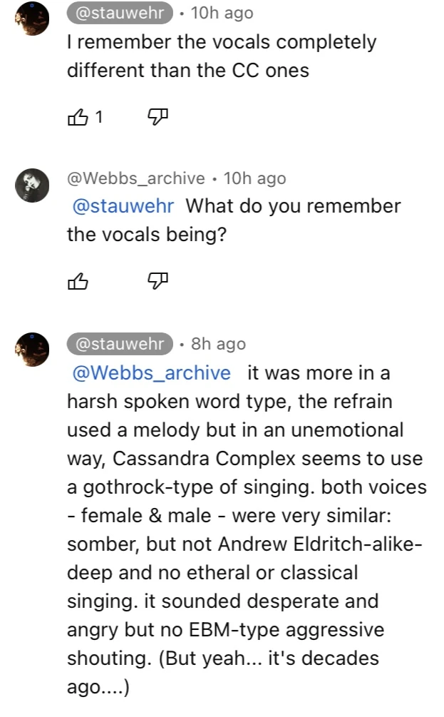 "It was more in a harsh spoken word type, the refrain used a melody but in an unemotional way, Cassandra Complex seems to use a gothrock-type of singing. both voices - female & male - were very similar: somber, but not Andrew Eldritch-alike-deep and no etheral or classical singing. it sounded desperate and angry but no EBM-type aggressive shouting. (But yeah... it's decades ago....)"[2]