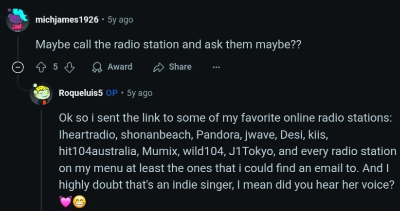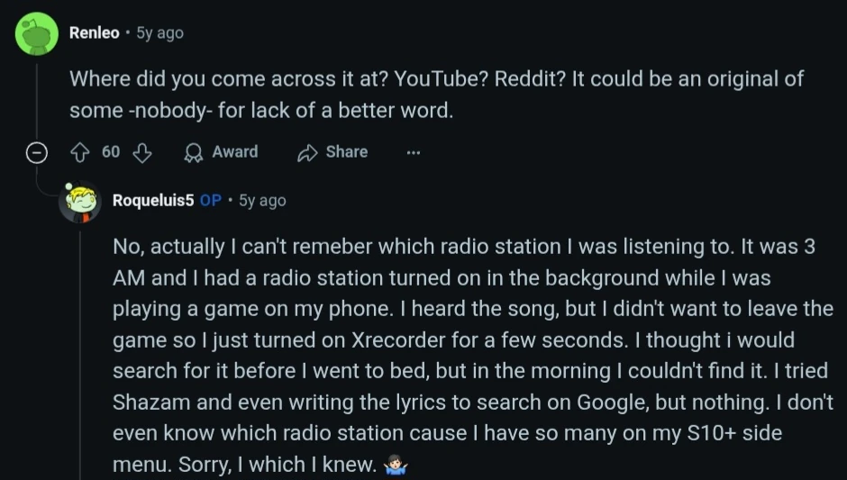 “No, actually I can't remeber which radio station I was listening to. It was 3 AM and I had a radio station turned on in the background while I was playing a game on my phone. I heard the song, but I didn't want to leave the game so I just turned on Xrecorder for a few seconds. I thought i would search for it before I went to bed, but in the morning I couldn't find it. I tried Shazam and even writing the lyrics to search on Google, but nothing. I don't even know which radio station cause I have so many on my S10+ side menu. Sorry, I which I knew. 🤷🏻♂️”[2]