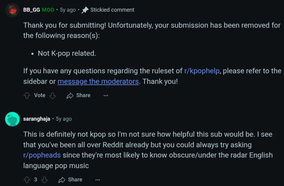 He also posted the song to the r/kpophelp subreddit after people suggested him to, asking who made it, but the mods deleted due to them not considering it to be a kpop song.[5]