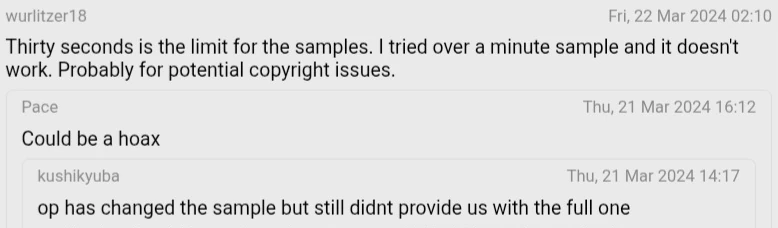 - Instead of uploading the full audio of the track, the OP altered the sample on WatZatSong, which adds to the suspicion.