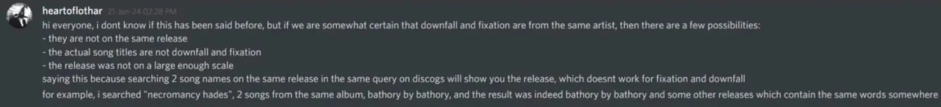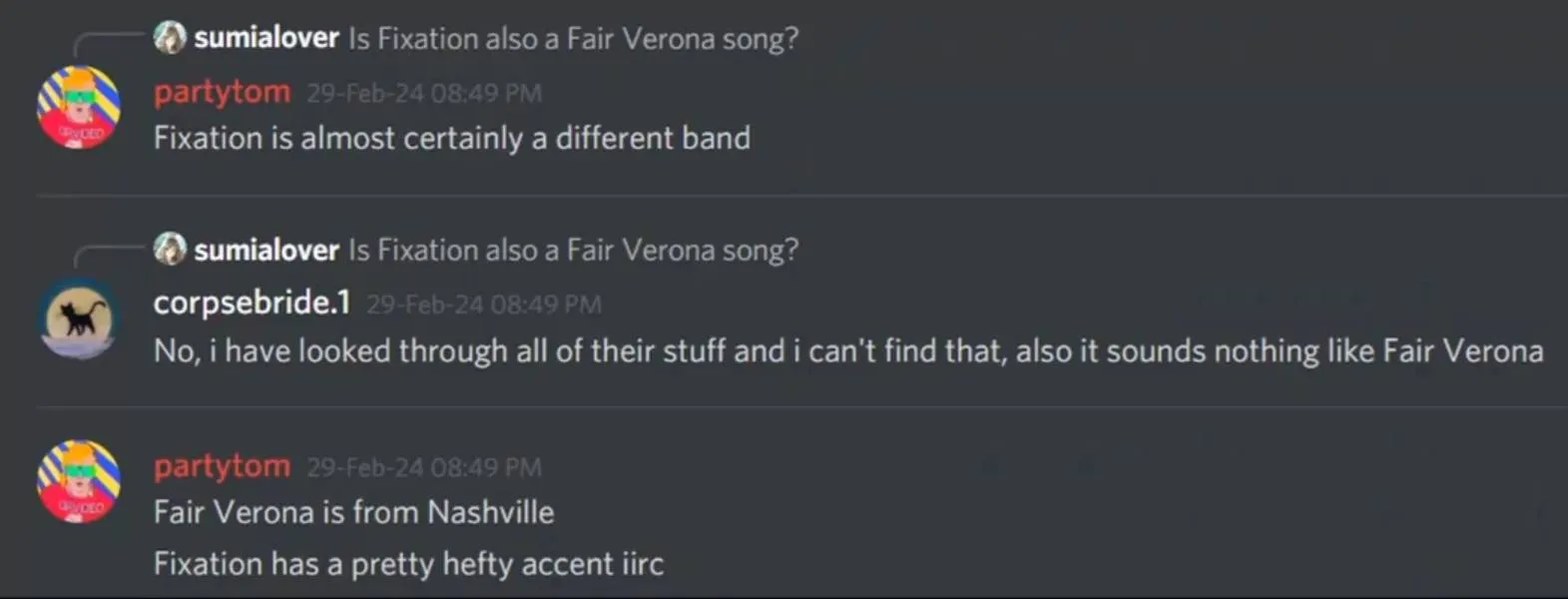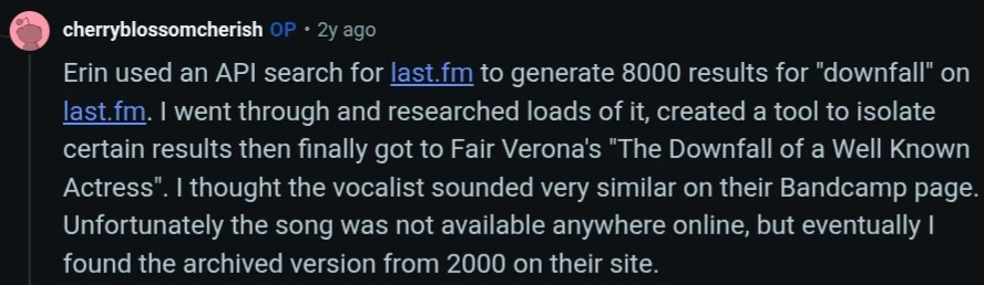 Prior to that song's solve, multiple users brought up the possibility of the song being by the same artist as Downfall[10], due to the similar origins, vocals, and styles. After it was identified as being by Fair Verona[11], they were ruled out.[12]