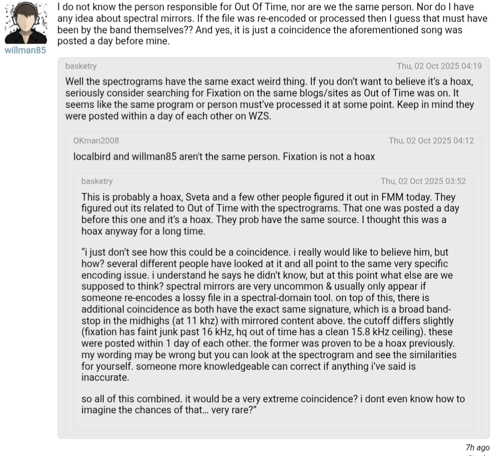“i just don’t see how this could be a coincidence. i really would like to believe him, but how? several different people have looked at it and all point to the same very specific encoding issue. i understand he says he didn’t know, but at this point what else are we supposed to think? spectral mirrors are very uncommon & usually only appear if someone re-encodes a lossy file in a spectral-domain tool. on top of this, there is additional coincidence as both have the exact same signature, which is a broad band-stop in the midhighs (at 11 khz) with mirrored content above. the cutoff differs slightly (fixation has faint junk past 16 kHz, hq out of time has a clean 15.8 kHz ceiling). these were posted within 1 day of each other. the former was proven to be a hoax previously. my wording may be wrong but you can look at the spectrogram and see the similarities for yourself. someone more knowledgeable can correct if anything i’ve said is inaccurate.