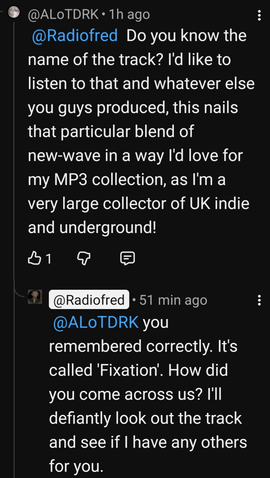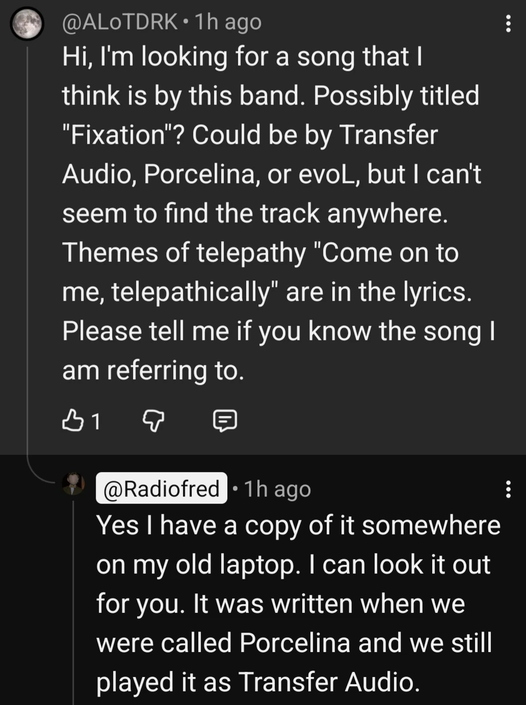 On the same day, user TSG commented on a YouTube video posted by user and band member Radiofred of a song by Transfer Audio, asking if the song was by the band. Fred confirmed the song was by them, he had a copy of it on his old laptop, it was made under Porcelina, though they still played it live under the Transfer Audio name[6], and it was titled Fixation.[7]