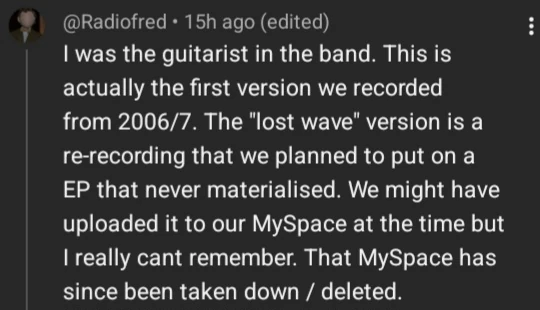 Two days later, Fred commented on LostwaveFinder's solved upload. He said that the version he posted was the first version the band recorded in 2006 or 2007 and the version willman posted was a re-recording meant for a scrapped EP. He also said the band might've posted the song to their now-deleted MySpace, but he didn’t remember.[9]