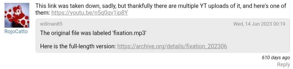 Sometime before January 27th, 2024, the link to the longer snippet went defunct, but it was archived by the reuploads.[3]