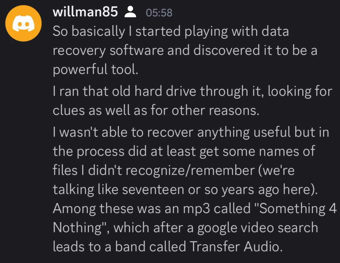 Among these was an mp3 called "Something 4 Nothing", which after a google video search leads to a band called Transfer Audio."[5]