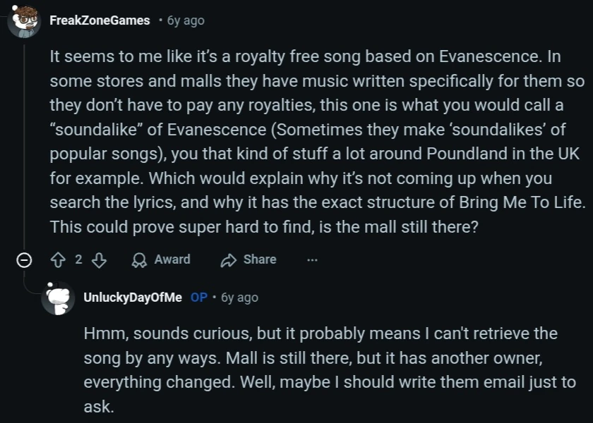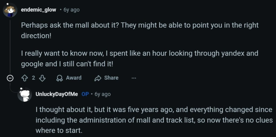 Two users, FretoZoneGames and endemic_glow, asked Unlucky to contact the mall about the song, they said it had a new owner and played different music.[5][6]