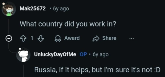 In reply to that, user Mak25672 asked what country Unlucky worked in, they said they worked in Russia, but they doubted the singer was Russian.[4]