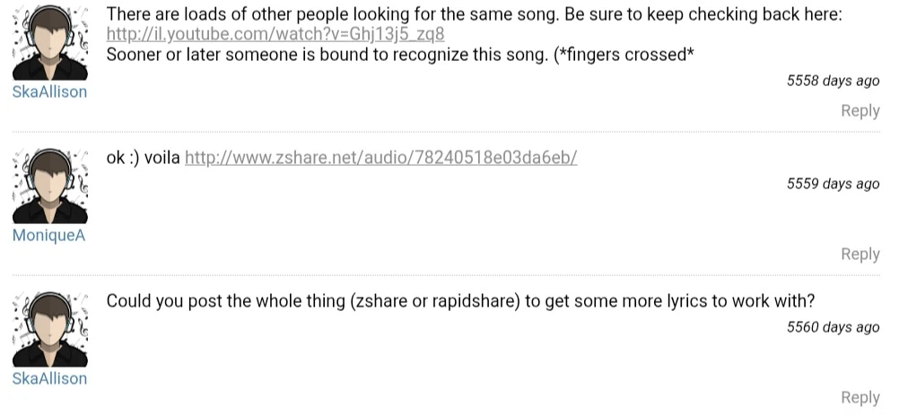 On May 27th, 2010, the song was posted to WatZatSong by user MoniqueA. User SkaAllison requested a longer snippet, and Monique provided one.[3]