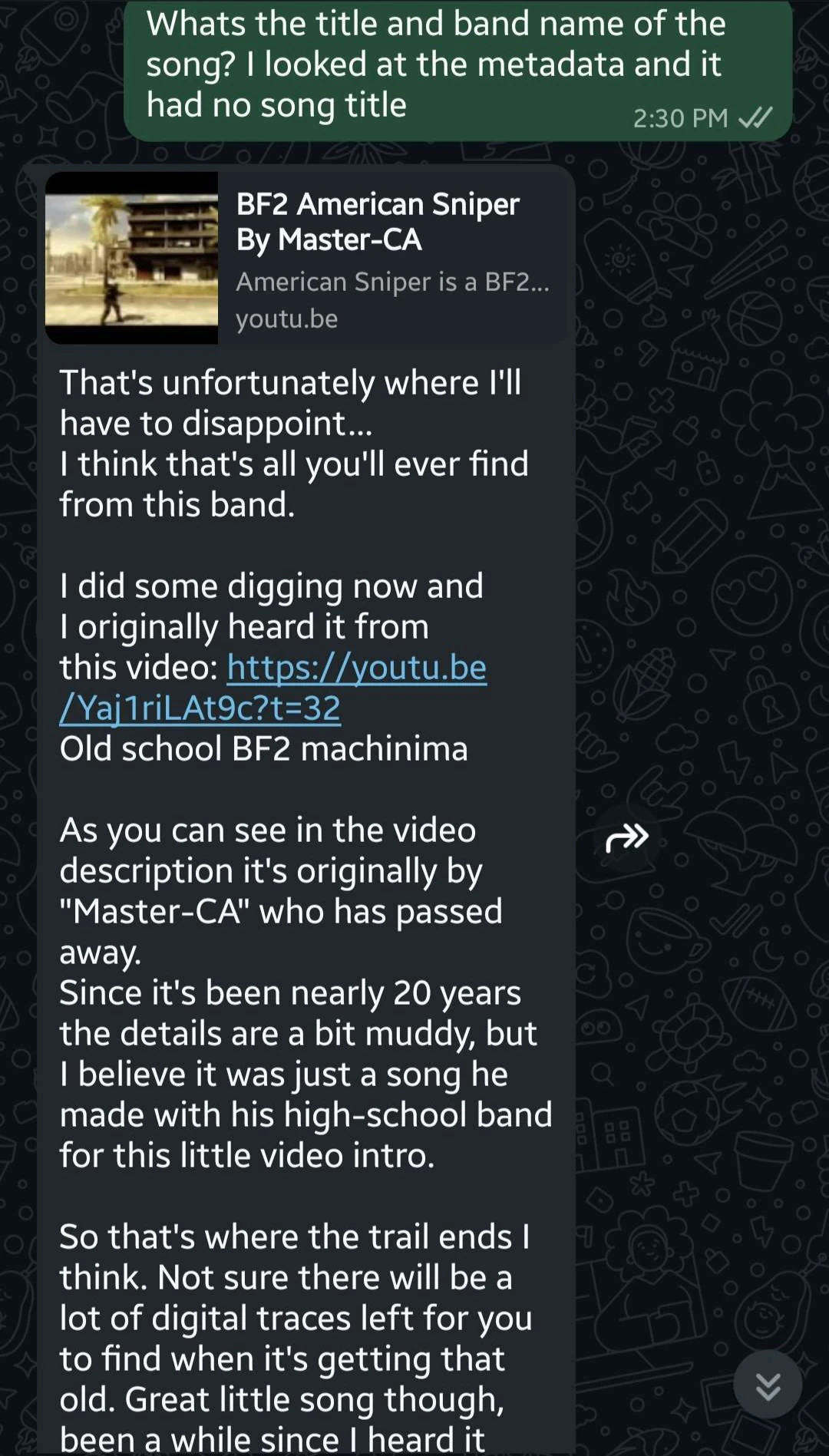 On May 27th, 2021, YouTube user Ezekiel De La Croix posted a tribute video for Master-CA. The tribute video featured the song, and the description read “the iconic theme song of the Sniper Series by Master-CA Wingardh”. In the comments the OP said they didn’t know the song’s name.