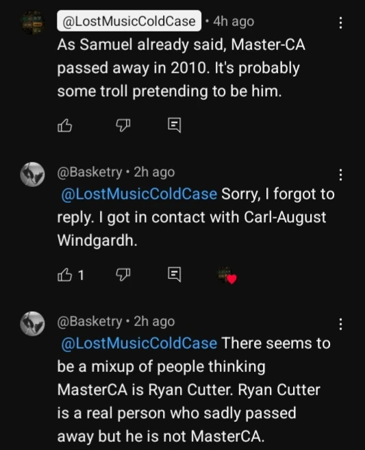On September 12th, 2025, Discord user Basketry discovered that Master-CA and Ryan Cutter were two different people, and Master-CA was still alive, though Ryan did die. She contacted him, but he said he did not remember who the song was by, but it was titled "Concrete" and was downloaded off a filesharing site that he downloaded Battlefield 2 mods off of.[6][7][8][9]