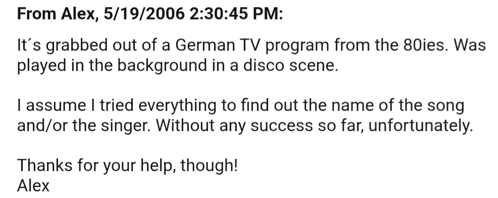 On May 19th, 2006, user Alex posted the 12 second snippet to Spirit of Radio. He said it came from the background of a disco scene of a German TV program from the 1980s. No other information was provided.[1]