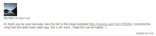 On October 17th, 2025, the OP posted a longer snippet to Vocaroo after Discord user SodaRev! contacted her on WZS. She also said she recorded it off of a radio station in the 1970s.[1]