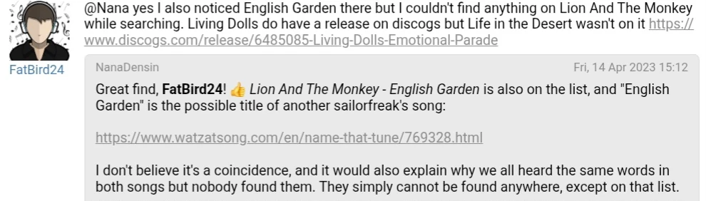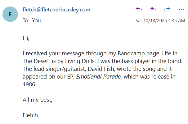 On October 17th, 2025, Discord user Hinoyt contacted former band member Fletcher Beasley via his bandcamp. The next day on October 18th, 2025, Fletcher responded and confirmed that the song was "Life In The Desert" by The Living Dolls.[4]