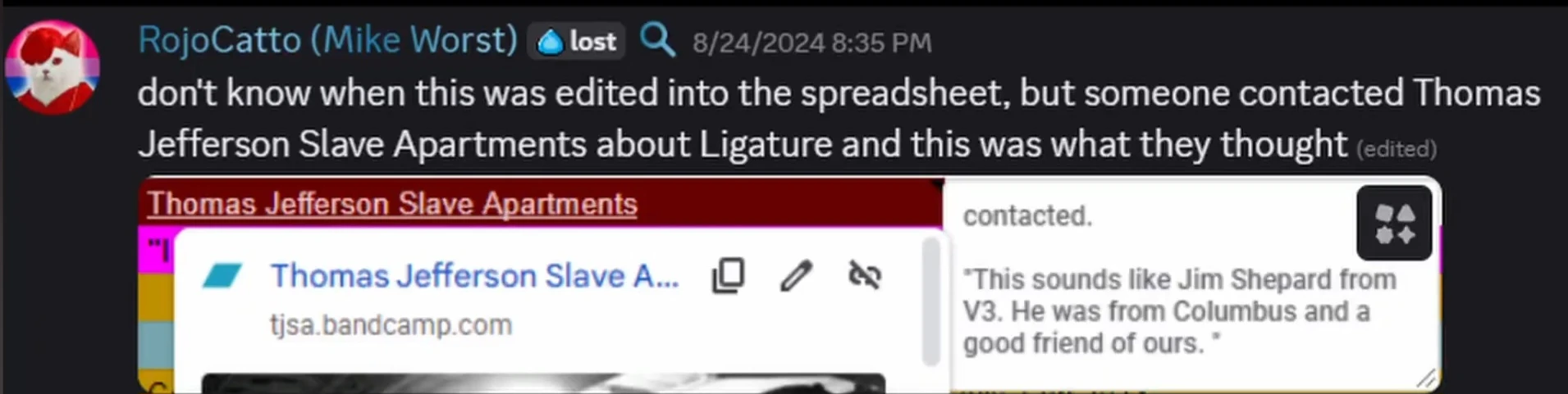 On August 24th, 2024, a member of Thomas Jefferson Slave Apartments was contacted by an anonymous user, and they confirmed the band didn't make the song, but said it sounded like Jim Shepard from V-3.[4]