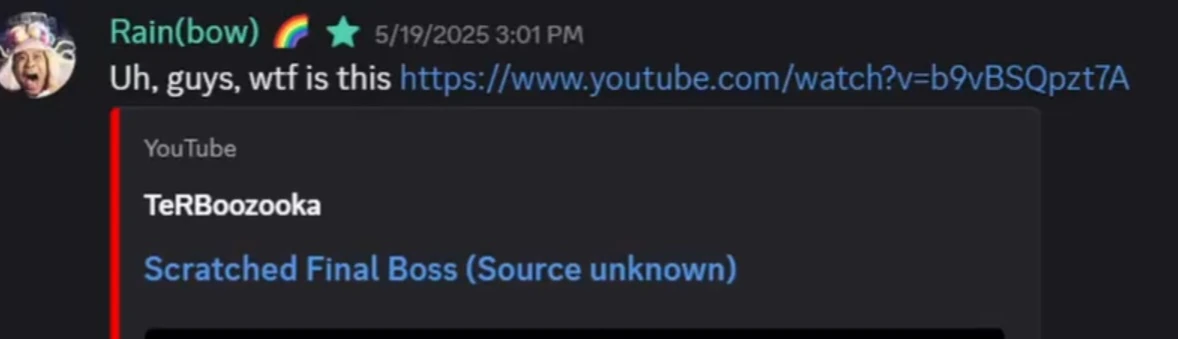 On May 19th, 2025, the full song was discovered by Rain[4] after finding another WZS post of the song by user Tixio from December 21st, 2023 after he ran it through WerZatSong. They said it was originally uploaded in July 2014 by user RSNxHolic under the name “Scratched Final Boss”. In the comments, Tixio linked the full song in a YouTube video, and said:
