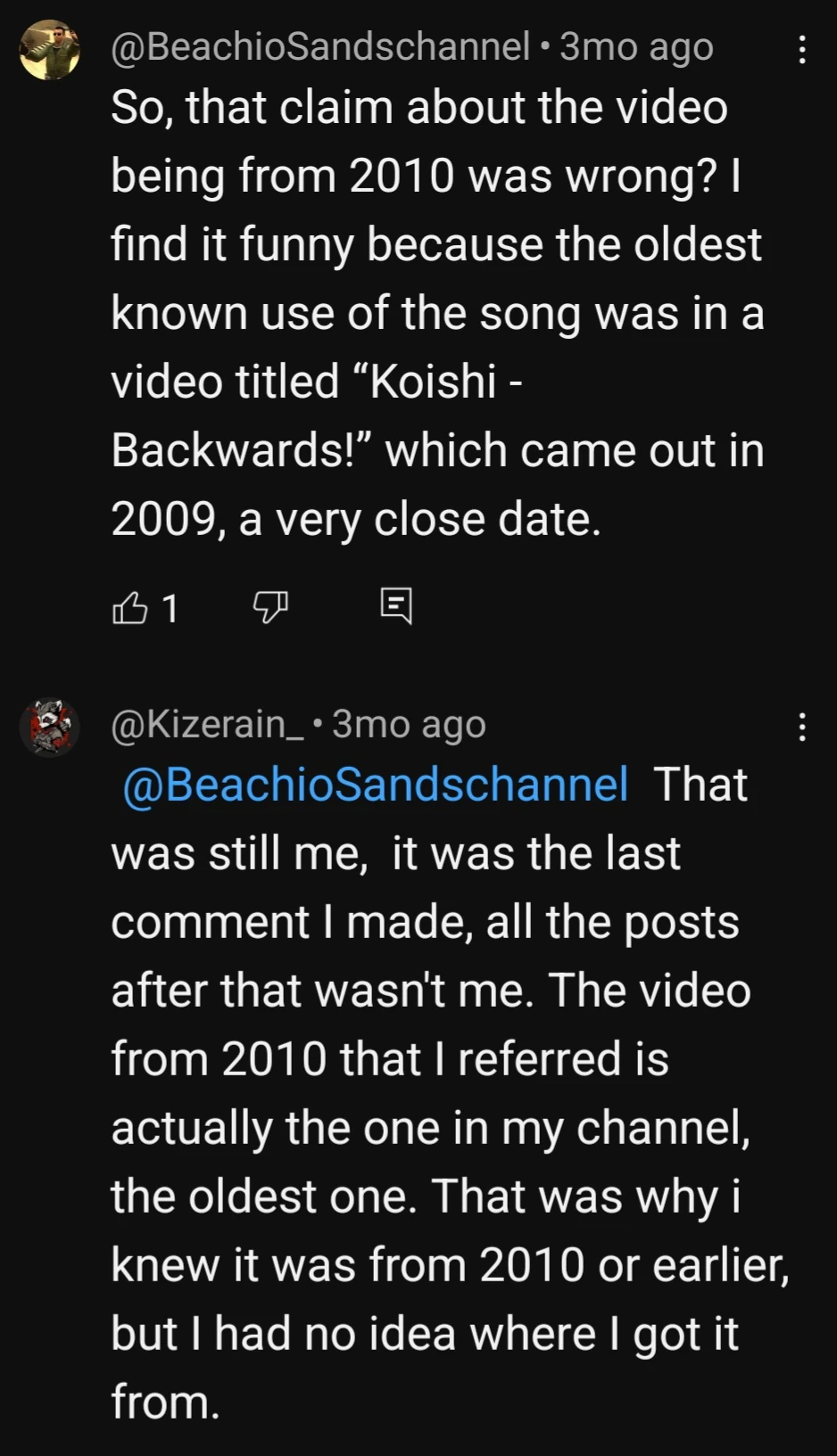 Almost three years later, on March 19th, 2024, the OP came back with more information about the song which he stated it was from before 2010 and was taken from a YouTube video that they could no longer find, before disappearing yet again.[2]