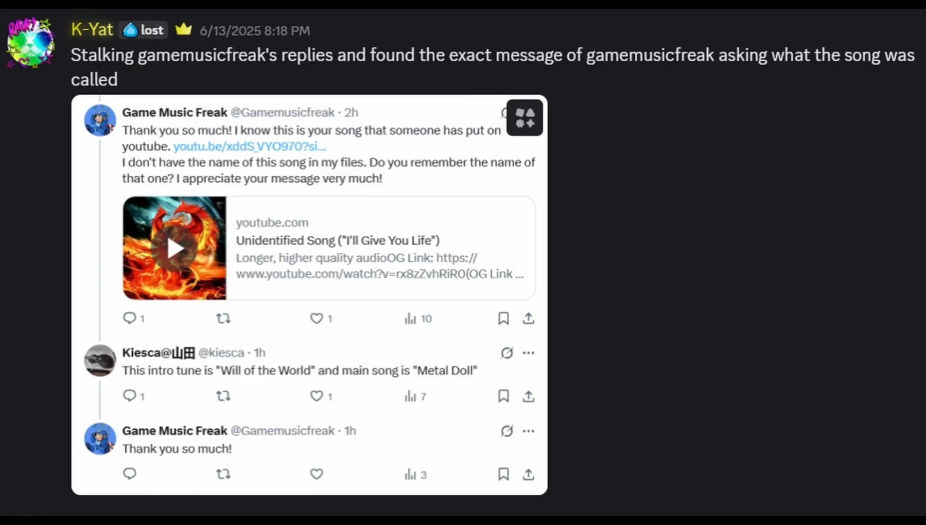 Kiesca was contacted by GMF via Twitter, and they said the song was two different songs of by them, the first being "Will Of The World" and the other "Metal Doll". But they said they didn’t have audio of the song on their PC anymore.[14][15]