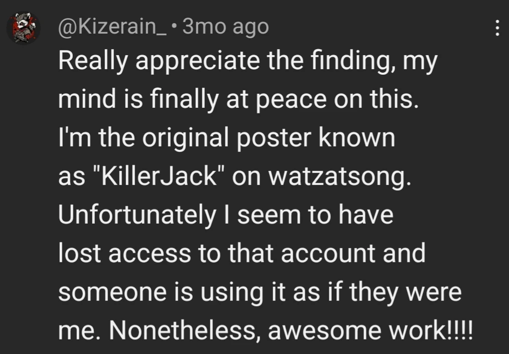 Two days later, the OP came back to the thread and commented on Q’s reupload to thank the searchers for finding the song. He said that someone else had hacked the account and was using it, but they only changed the Email, not the password[18]. He said the last thing he said was him providing the song’s origin in March of 2024.[19]