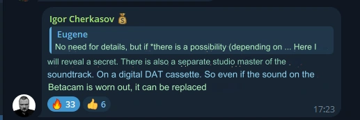 However, we are making progress in the negotiations. We know for sure that Natalya has a BETACAM tape with a master clip! We have already found a person with the necessary equipment ready to digitize it. We just have to wait for the moment when she will be able to give it to us for digitization."[17]