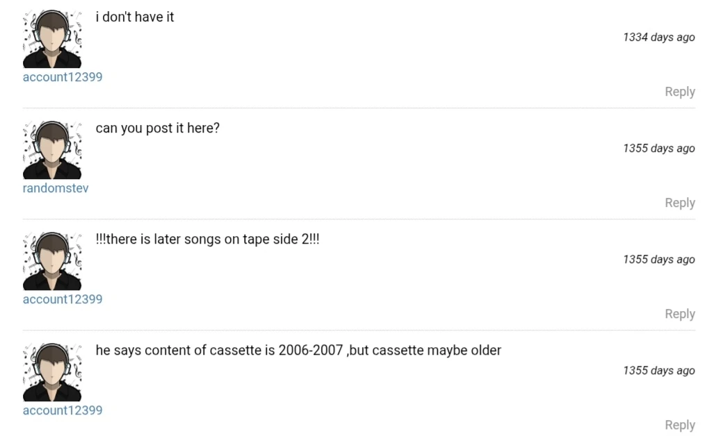 On January 11th, the OP said their friend said the contents of the cassette were recorded between 2006-2007, and it had a second side with more songs.[7]