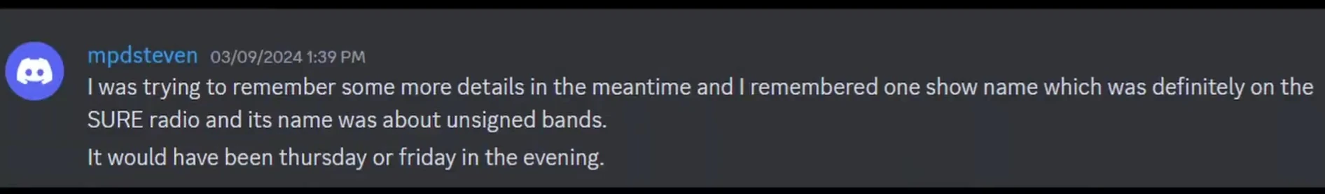 On March 9th, Mpdsteven joined the FMM Server[13]. He gave additional info, saying that he recorded the song on a Thursday or Friday evening[14]. He said he was 100% the radio show that played the song had the word "Unsigned" in its name[15], and that the DJ’s name was Henry, but he wasn’t 100% certain on that. He eventually went inactive.