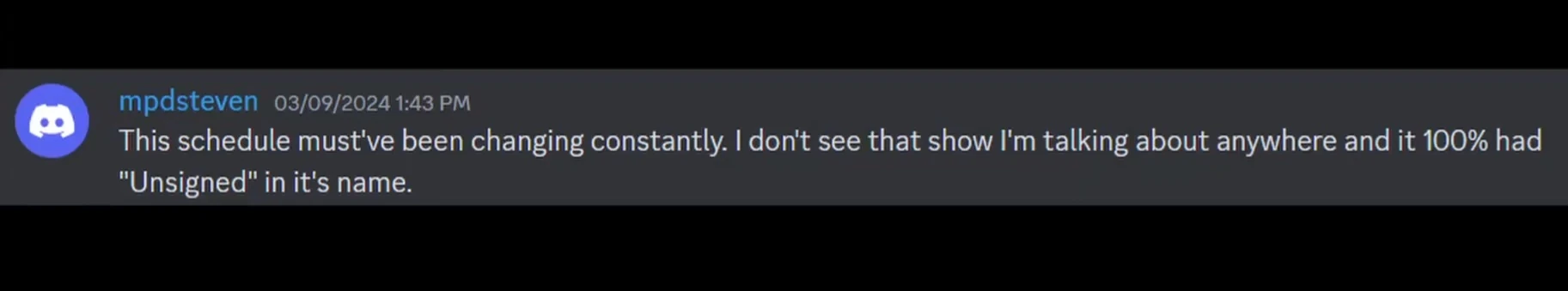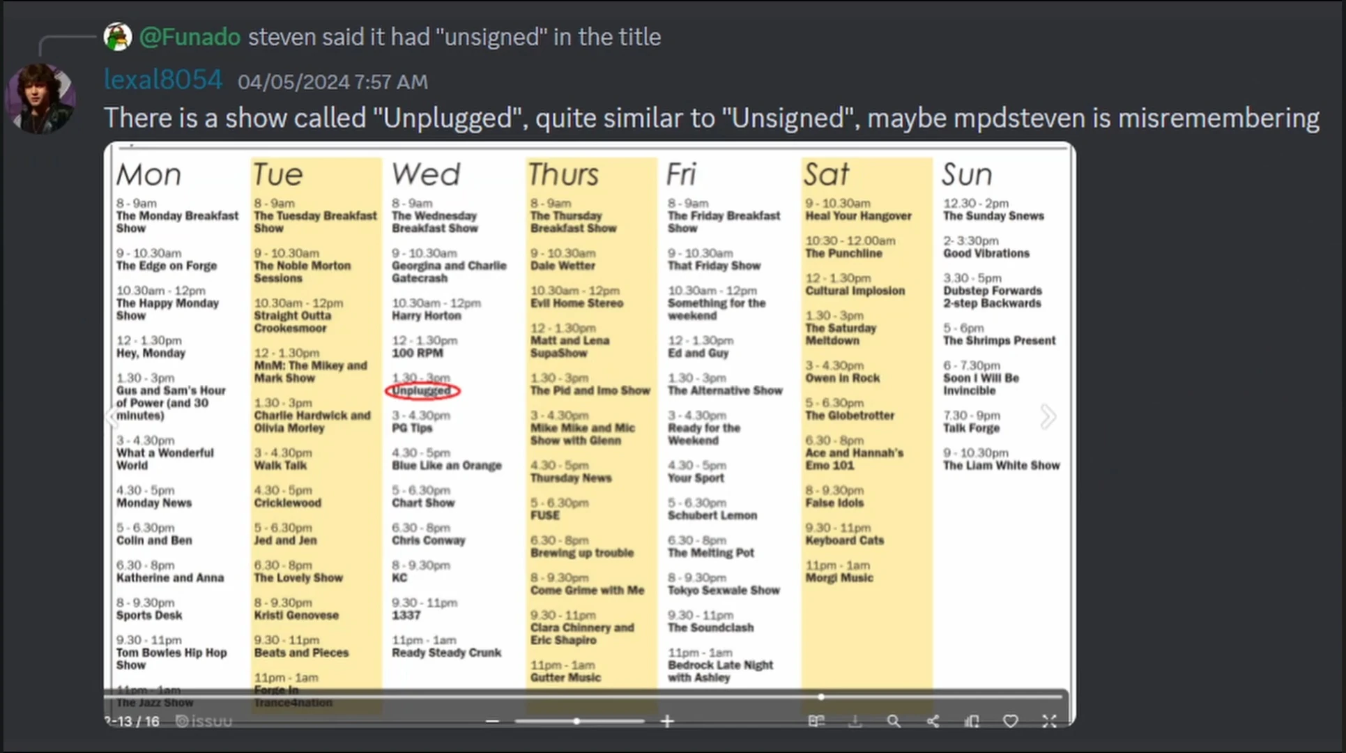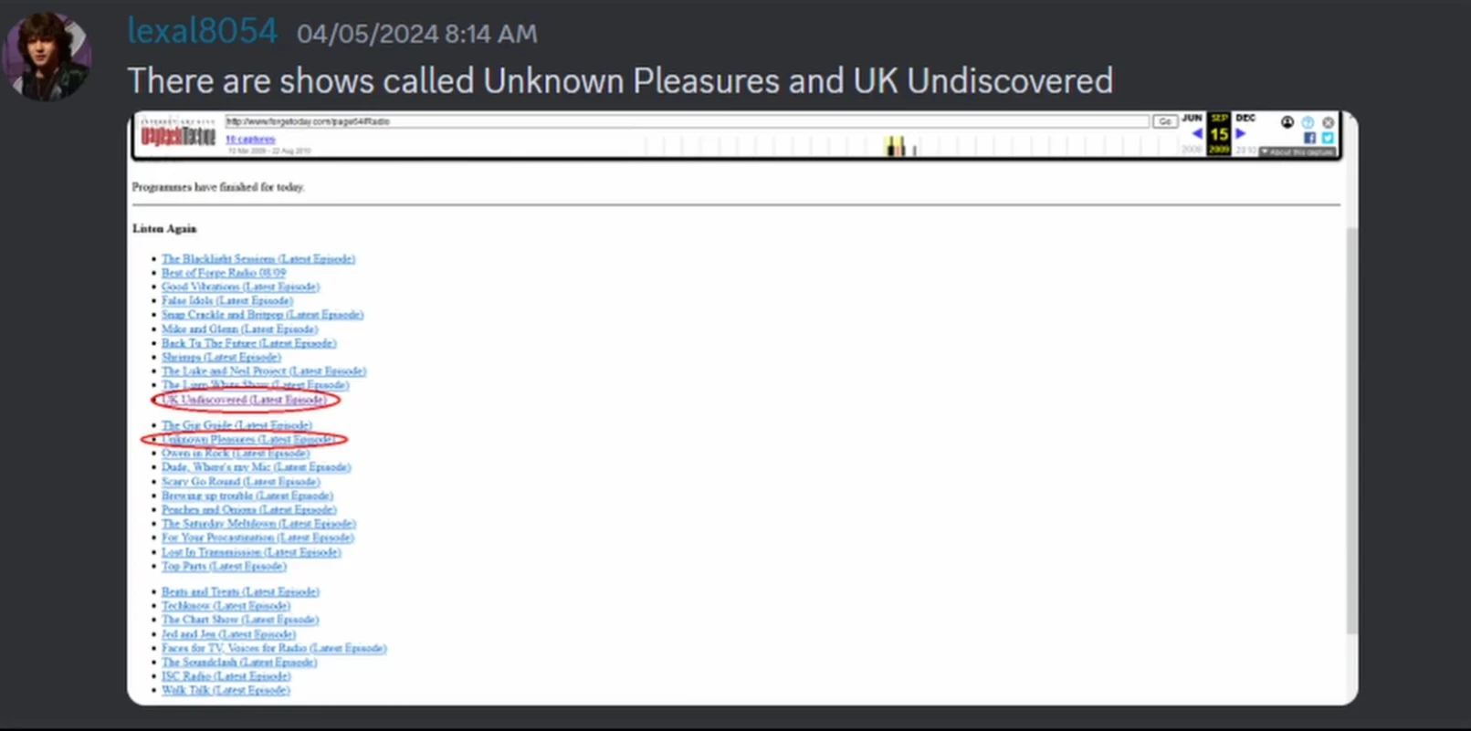 On April 5th, Discord user Lexal8054 found an archive of the Forge Radio schedule from around 2009. There were shows called Unplugged, Unknown Pleasures, and UK Undiscovered[16][17], but nothing with Unsigned in the name. Unplugged can be ruled out though, since it was dedicated to live and/or acoustic versions of songs.