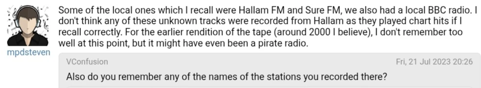"Some of the local ones which I recall were Hallam FM and Sure FM, we also had a local BBC radio. I don't think any of these unknown tracks were recorded from Hallam as they played chart hits if I recall correctly. For the earlier rendition of the tape (around 2000 I believe), I don't remember too well at this point, but it might have even been a pirate radio."[12]