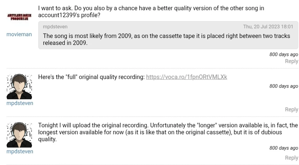 On September 28th, mpdsteven was fully confirmed to be a hoaxer after it was discovered that another song he posted (Euphoric Dream by A Note Two Self) was directly taken from a live performance available on YouTube, meaning that the songs on his “tape” were not all recorded from a radio station as he claimed.[19][20][21]