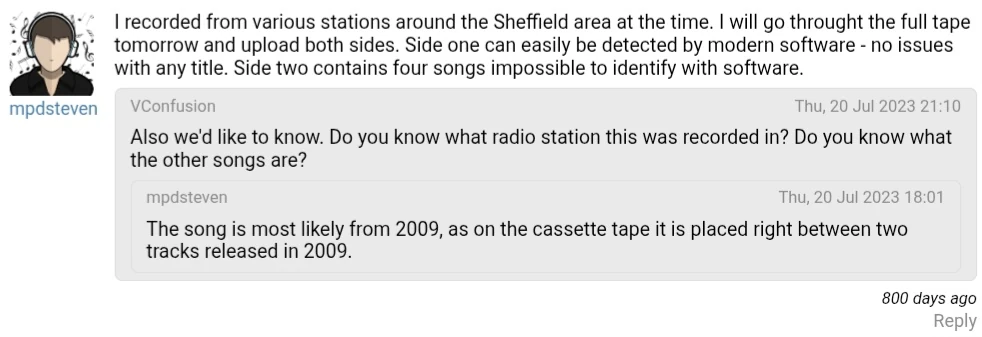 "I recorded from various stations around the Sheffield area at the time. I will go throught the full tape tomorrow and upload both sides. Side one can easily be detected by modern software - no issues with any title. Side two contains four songs impossible to identify with software."[10]
