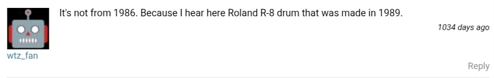 On December 6th, 2022, after users started to theorize the song was from around 1986, a deleted WZS user discovered the drum machine the song used was created in 1989, meaning the song was most likely from the 1990s.[1]