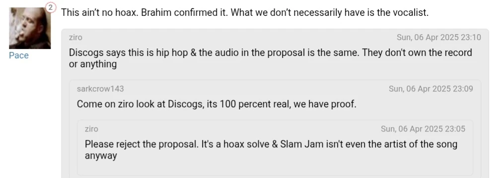 Users quickly doubted this claim, due to the audio Pace used being the exact same as the audio in the original upload, Pace being a known hoaxer who faked solving Forever, the album being categorized as hip-hop on Discogs, and other songs in Port Antonio Publishing’s catalog not sounding similar.