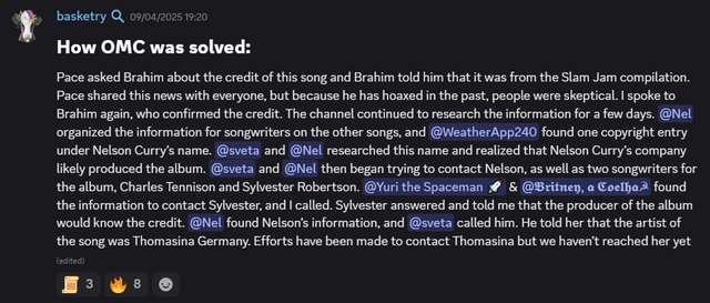On April 8th, 2025, LWFW user SodaRev! contacted one of the people owned the album, who also confirmed that the song was the same. Later that day, the producer of the album was found by users Yuri and Britney, and he was contracted by users Nel and Sveta, he redirected to the writer of the song, Nelson Curry, who said it was by Thomasina Germany, but no online presence of Thomasina could be found.