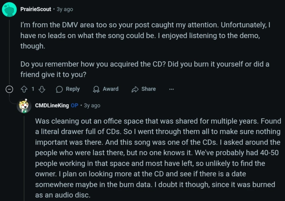 The song was posted to the r/lostmedia and r/lostwave SubReddits on September 9th, 2022 by user CMDLineKing. He found the song in a pile of CDs that only had one song. The CD didn’t have any writing on it and he theorizes it’s a demo.