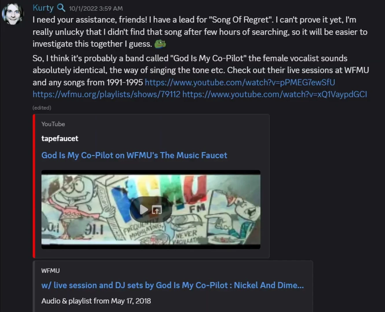 On October 1st, 2022, user Kurty brought up the possibility of the band God Is My Co-Pilot being behind the song, due to their style and vocalist sounding similar, and them performing multiple live sessions on WFMU during the 1990s[4]. Despite multiple band members being contacted, it was only ruled out after the song was solved.