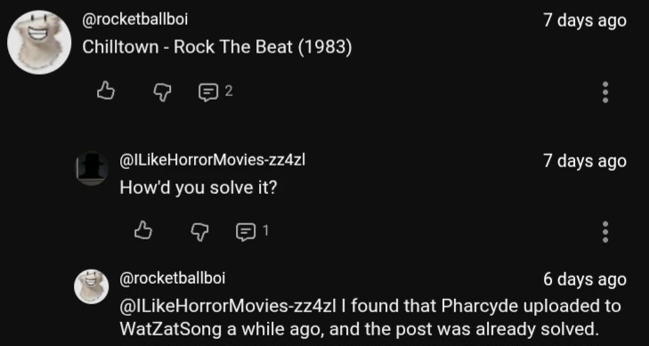 On November 16th, 2025, the song was identified by Discord user rocketballboi as Rock The Beat (Edited Version) by Chilltown after he discovered a solved WatZatSong post of same song by user Pharcyde September 5th, 2012. It was identified by Pharcyde himself.[1]
