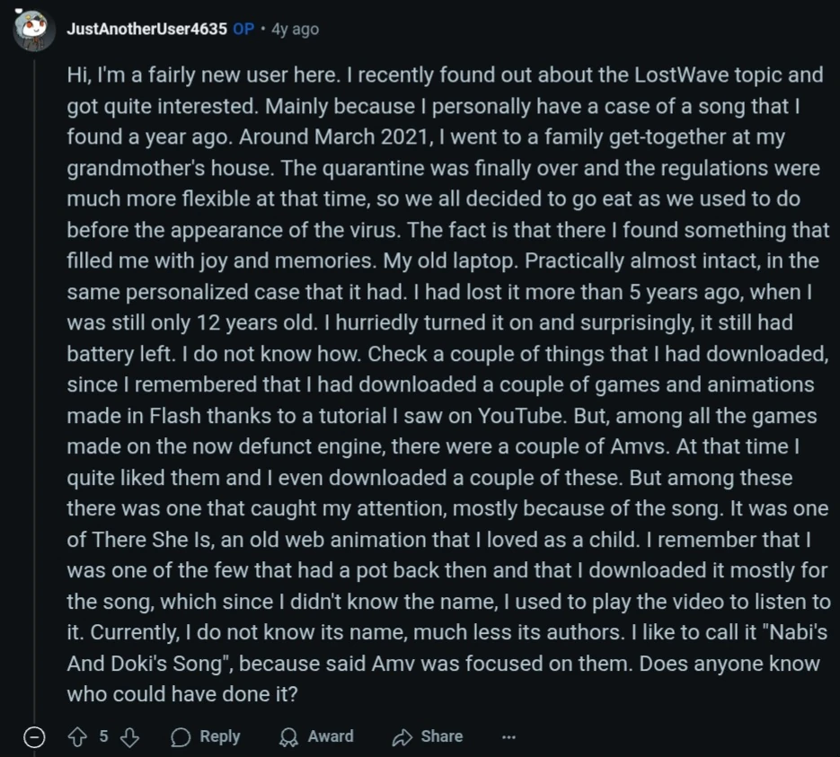 "Hi, I'm a fairly new user here. I recently found out about the LostWave topic and got quite interested. Mainly because I personally have a case of a song that I found a year ago. Around March 2021, I went to a family get-together at my grandmother's house. The quarantine was finally over and the regulations were much more flexible at that time, so we all decided to go eat as we used to do before the appearance of the virus. The fact is that there I found something that filled me with joy and memories. My old laptop. Practically almost intact, in the same personalized case that it had. I had lost it more than 5 years ago, when I was still only 12 years old. I hurriedly turned it on and surprisingly, it still had battery left. I do not know how. Check a couple of things that I had downloaded, since I remembered that I had downloaded a couple of games and animations made in Flash thanks to a tutorial I saw on YouTube. But, among all the games made on the now defunct engine, there were a couple of Amvs. At that time I quite liked them and I even downloaded a couple of these. But among these there was one that caught my attention, mostly because of the song. It was one of There She Is, an old web animation that I loved as a child. I remember that I was one of the few that had a pot back then and that I downloaded it mostly for the song, which since I didn't know the name, I used to play the video to listen to it. Currently, I do not know its name, much less its authors. I like to call it "Nabi's And Doki's Song", because said Amv was focused on them. Does anyone know who could have done it?"[3]