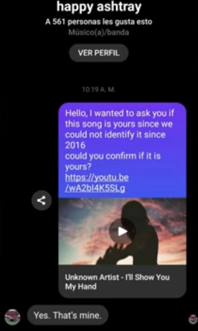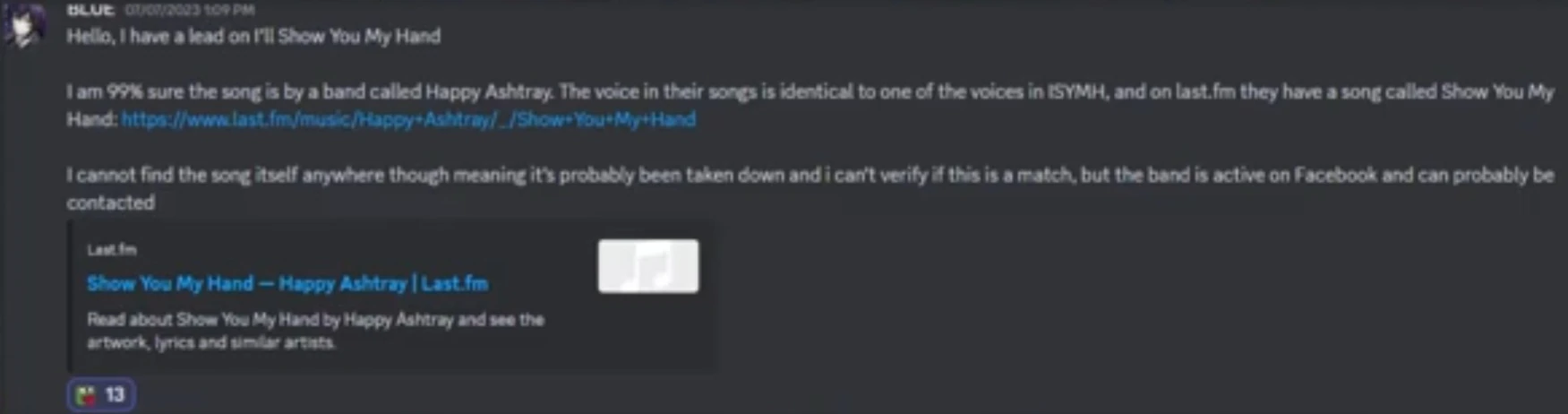 On July 7th, 2023, Discord user BLUE discovered a band called Happy Ashtray, they sounded identical to the song and they had a song listed on Last.fm called Show You My Hand, but no audio of the song was available online.[4][5]