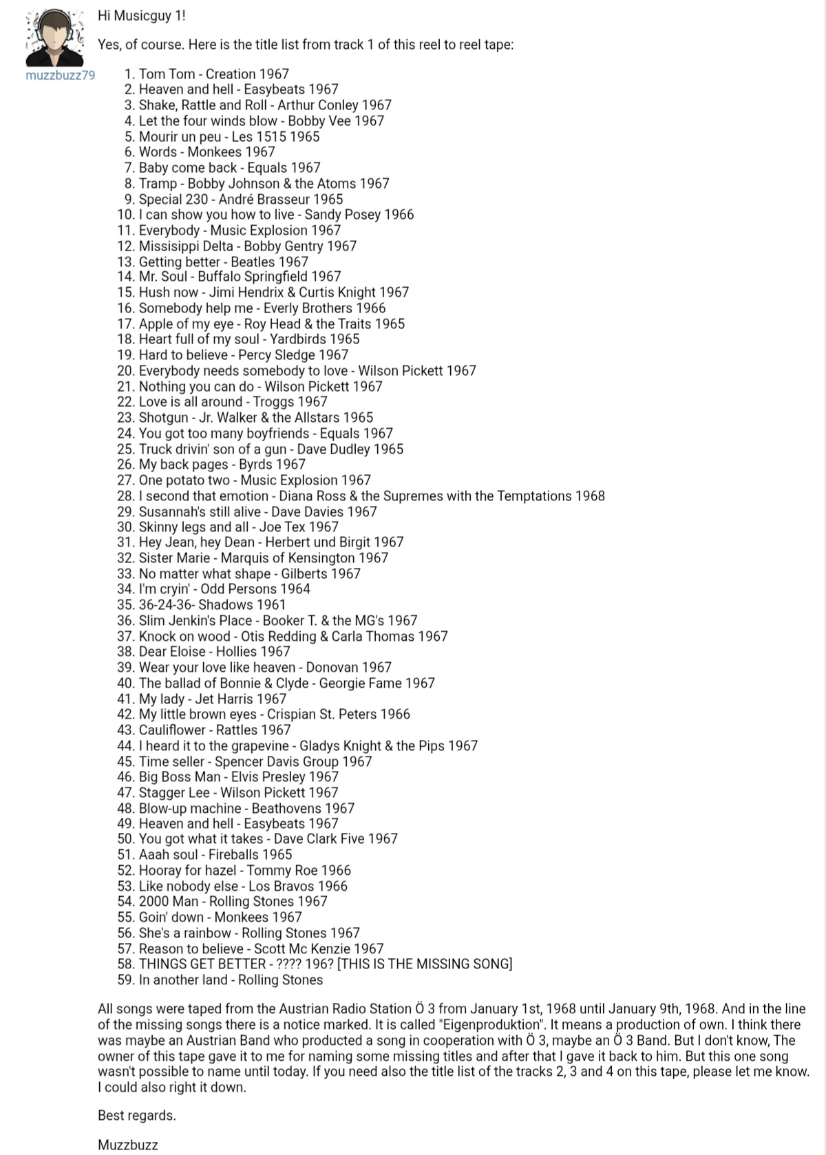 On December 16th, 2024, the OP posted the full tape tracklist in the replies of the original post. The oldest song was from 1964, and the newest song was from 1967.[3]
