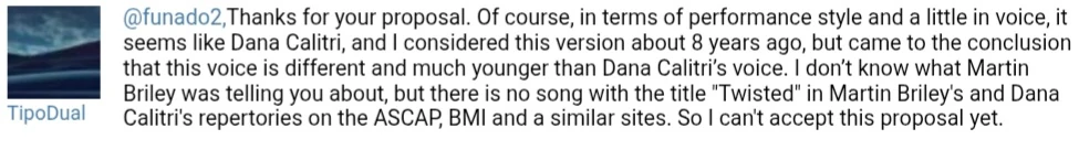 "Thanks for your proposal. Of course, in terms of performance style and a little in voice, it seems like Dana Calitri, and I considered this version about 8 years ago, but came to the conclusion that this voice is different and much younger than Dana Calitri’s voice. I don’t know what Martin Briley was telling you about, but there is no song with the title "Twisted" in Martin Briley's and Dana Calitri's repertories on the ASCAP, BMI and a similar sites. So I can't accept this proposal yet.[5]