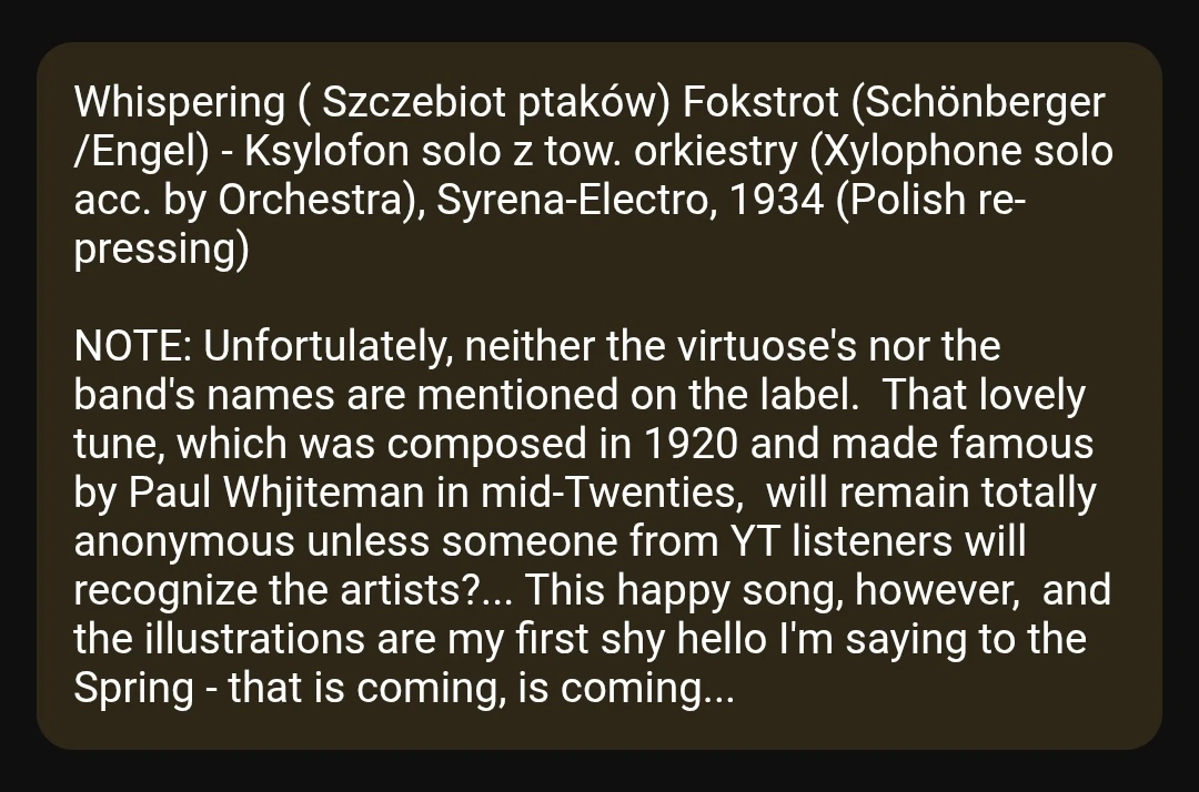 "NOTE: Unfortulately, neither the virtuose's nor the band's names are mentioned on the label. That lovely tune, which was composed in 1920 and made famous by Paul Whjiteman in mid-Twenties, will remain totally anonymous unless someone from YT listeners will recognize the artists?..."[2]