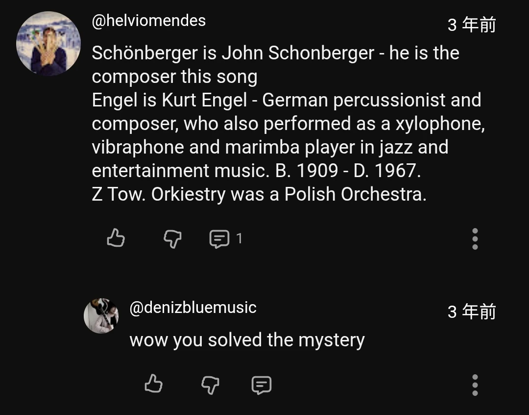 "Schönberger is John Schonberger - he is the composer this song Engel is Kurt Engel - German percussionist and composer, who also performed as a xylophone, vibraphone and marimba player in jazz and entertainment music. B. 1909 - D. 1967. Z Tow. Orkiestry was a Polish Orchestra."[1]