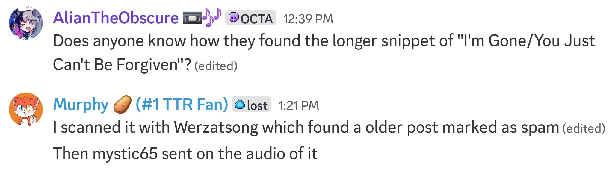 Four days later, Discord user Murphy ran the song through WerZatSong, and a now deleted WZS post came up. Discord user Mystic65 found audio of the post, and it was a different 30 second snippet.[1]