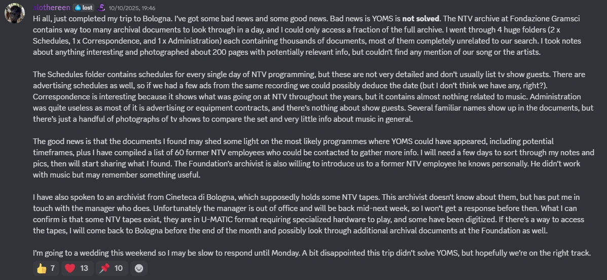 On October 10th, Discord user slothereen visited the Gramsci Foundation and the Cineteca di Bologna. At the Gramsci Foundation, they examined four out of the 24 folders from the NTV archive, photographing approximately 200 pages of potentially relevant material.